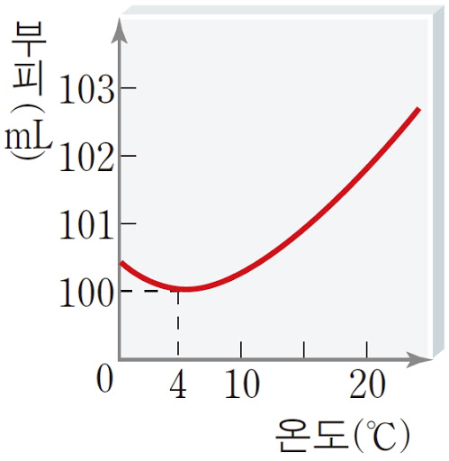 학교 다닐 때 온도에 따른 물의 부피 변화에 대해 배워보셨을 겁니다. 물은 4℃일 때 가장 부피가 적습니다. 4℃를 기점으로 온도가 올라가거나 내려가면 부피는 증가합니다.