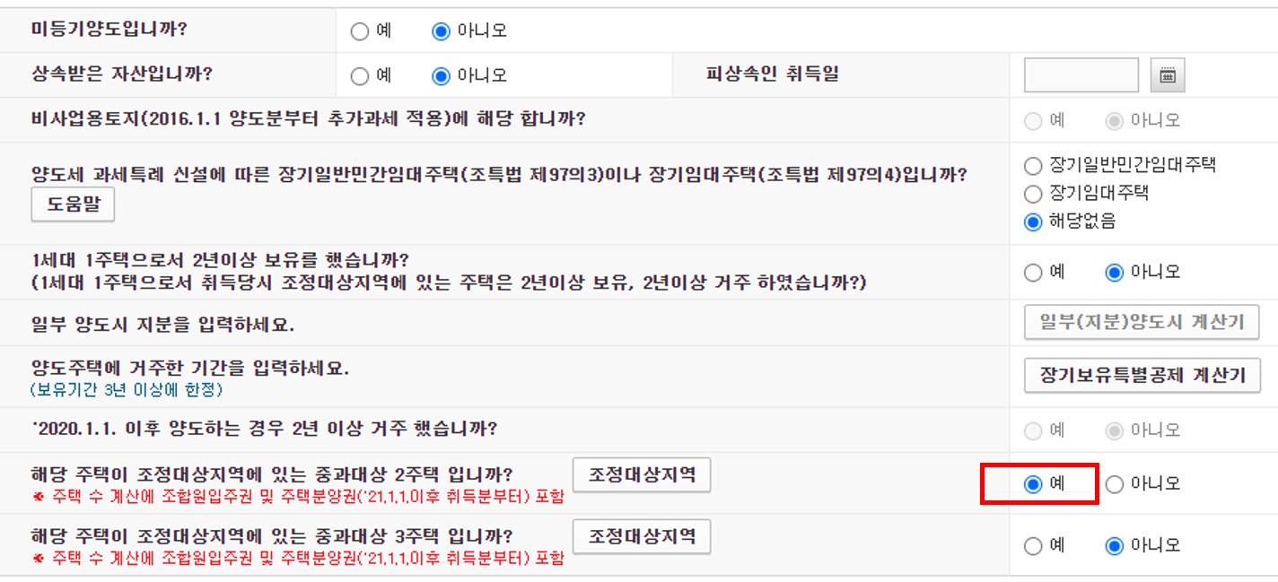 그런데 기타사항을 다시 점검 하다보니 해당 주택이 조정대상지역에 있는 중과대상 2주택 입니까? 라는 질문에 '예'라고 답해야 함을 알게되었습니다.