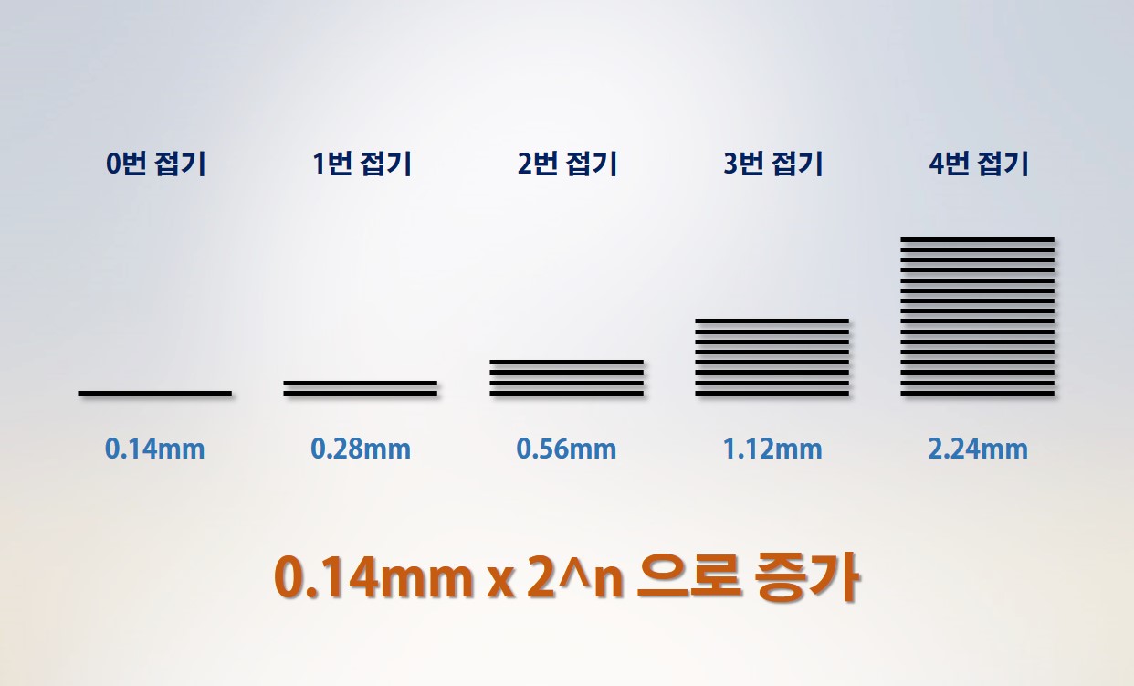 한번 더 접으면 어떻게 될까요? 두겹이 된 종이를 한번 더 접으면 네겹이 됩니다. 두께는 0.14mm x (2 x 2) = 0.56mm 가 됩니다. 세번 접으면 8장이 되면서 두께는 0.14mm x (2 x 2 x 2) = 1.12mm 가 됩니다. 2의 n승 만큼 종이가 쌓이면서 두께가 두꺼워지게 됩니다.