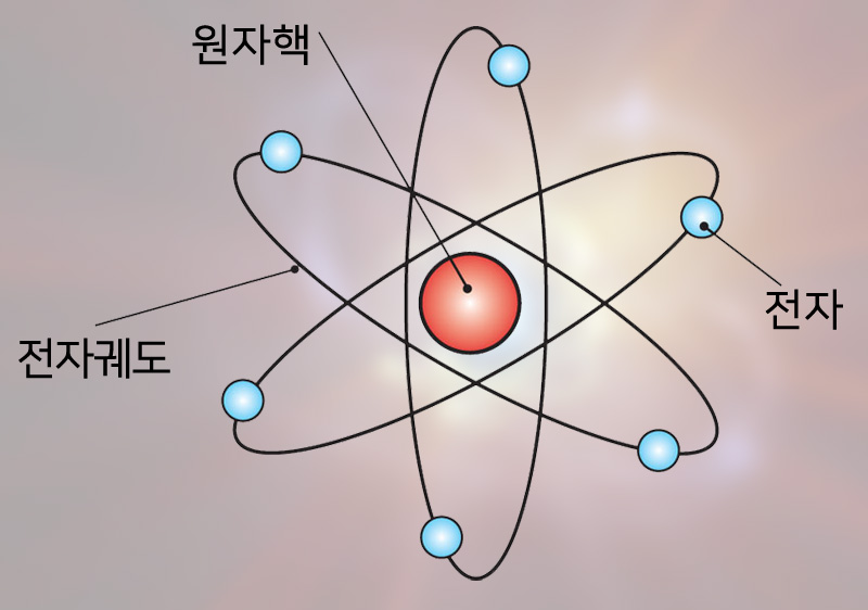 원자는 원자핵과 전자로 구분됩니다. 원자핵은 다시 양성자와 중성자로 나뉘는데 양성자는 +극을 띠고 있고 전자는 -극을 띠고 있습니다. 원자핵을 전자가 돌고 있다는 개념은 1911년 러더퍼드가 만들었습니다. 우리가 흔히 알고 있는 원자의 이미지입니다.