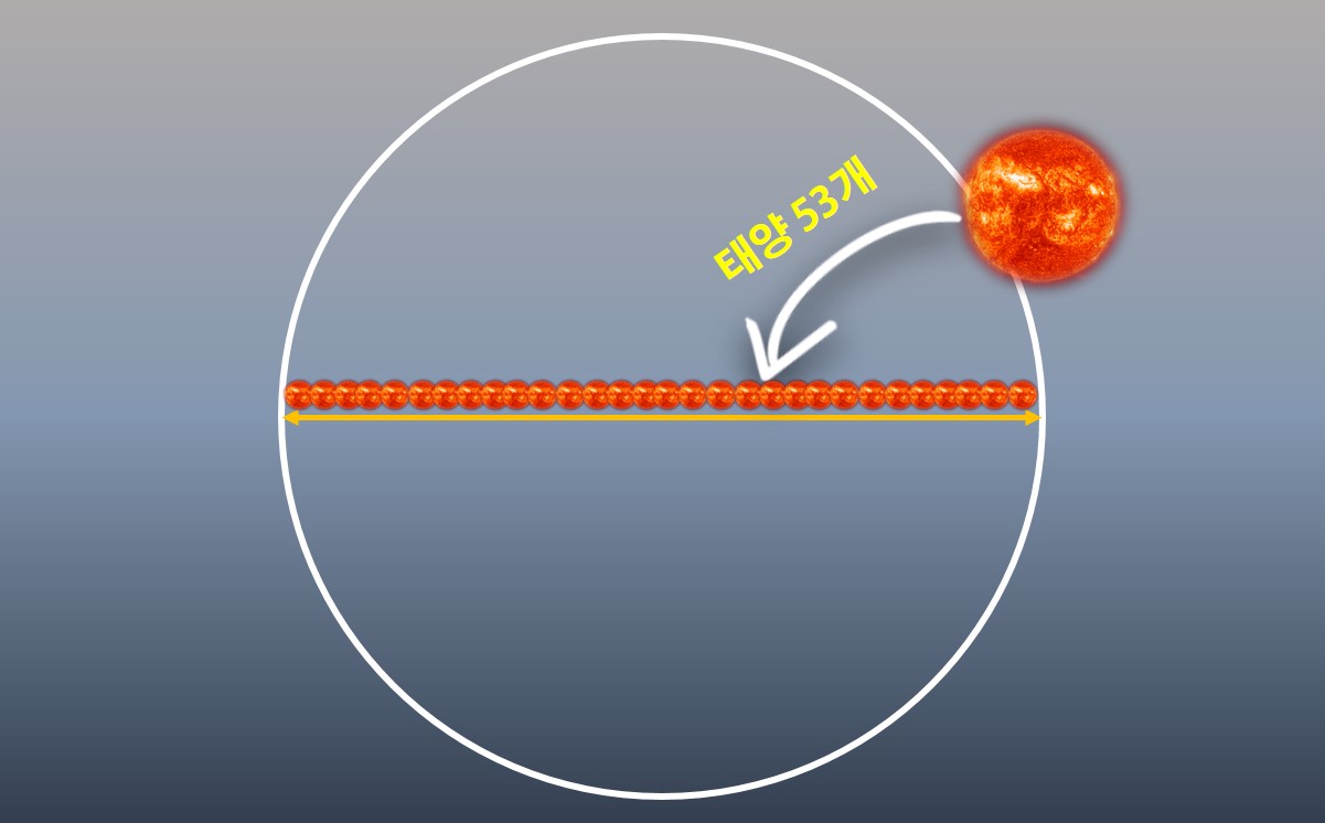 이 수치는 태양(지름 1,392,000km)의 53배 크기입니다. 따라서 우리 지구는 태양 53개를 일렬로 세운 길이를 지름으로 하는 면적에 1mm짜리 모래 한 알과 같은 크기라고 할 수 있는 것입니다.