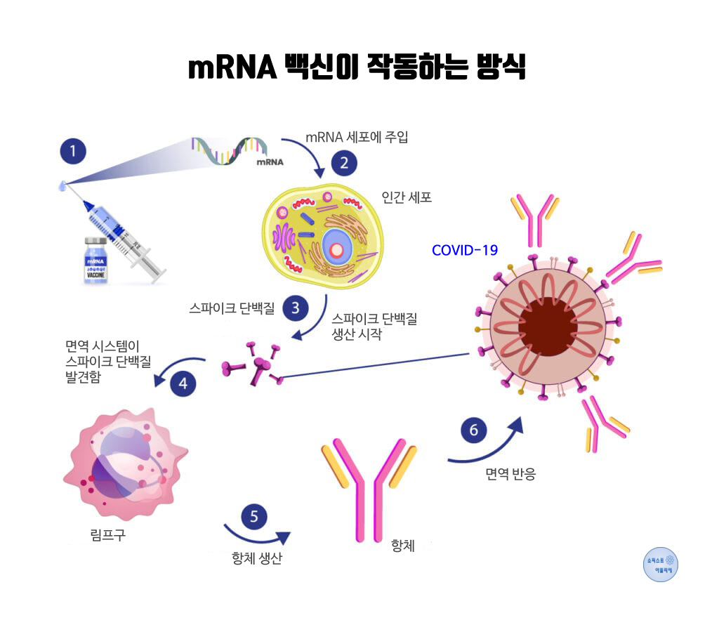 mRNA 백신은 코로나 바이러스의 스파이크 단백질 유전정보(DNA)를 담고 있는 mRNA를 주사하는 것입니다. mRNA가 주입되면 사람 세포에 있는 리보솜에서 묻지도 따지지도 않고 해당 단백질을 만들어 냅니다. 이렇게 우리 세포속 리보솜이 코로나 바이러스의 스파이크 단백질을 만들어내면 우리 몸의 면역체계가 외부 침입자로 간주하여 항체를 형성하여 면역체계를 만드는 원리입니다.