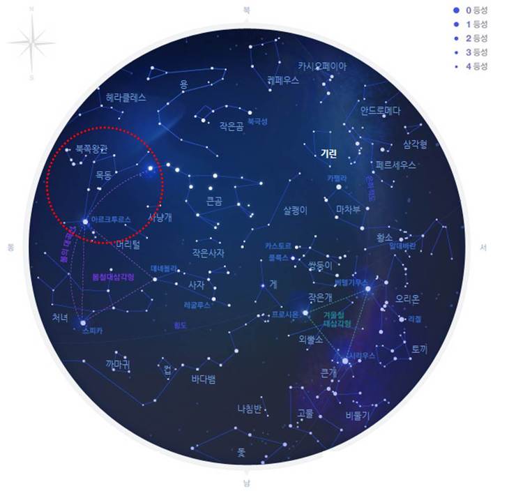 목동자리는 봄부터 초여름까지 동쪽 하늘에서 볼 수 있는 상당히 큰 별자리입니다. 북두칠성의 국자쪽 옆에 위치하고 있습니다.