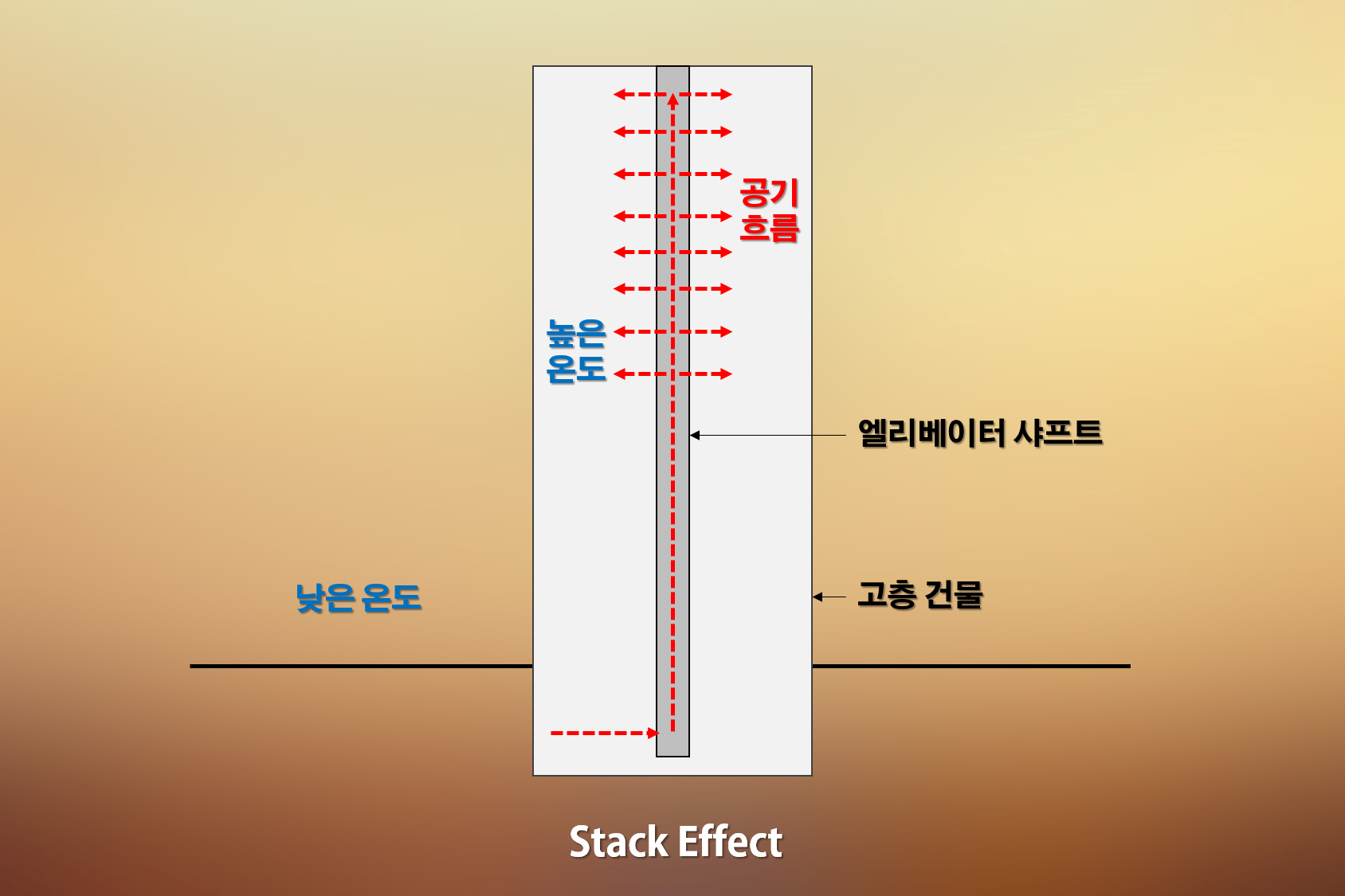 건축물 내부의 온도가 바깥보다 높고 밀도가 낮을 때 건물 내의 공기가 부력을 받아 이동합니다. 보통 공기의 흐름은 지하 주차장에서 건물 코어(Core)에 있는 엘리베이터 샤프트(Shaft) 또는 기밀되지 않는 수직 통로 등을 타고 건물 꼭대기까지 흐르면서 주변 공간으로 이동하게 됩니다.
