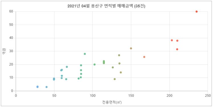 그에 비해 해운대구는 적은 전용면적의 적은 금액의 부동산 거래가 집중되었음을 알 수 있습니다. 해운대구에서도 비싼 것은 25억원에 육박하는 거래가 있긴 했습니다. 이렇게 이 사이트를 이용하면 지역별로 어떤 평형의 부동산들이 주로 거래되고 있고 얼마에 거래되는지를 알 수 있어서 자주 보는 편입니다.