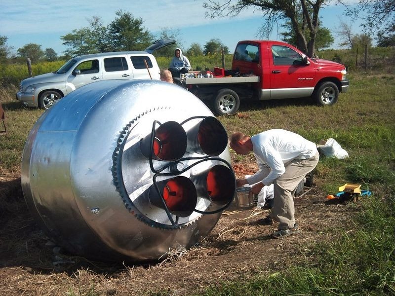 버려진 믹서를 마을 주민들이 발견했지만 마을 주민들이라고 이걸 치울 방법은 없었죠. 그래서 그걸 치우는 대신 다른 방식으로 사용하게 됩니다. 일단 이후 50년간 그 믹서는 많은 그래피티 예술가들의 도화지가 되었습니다. 그렇게 아무런 가치를 가지고 있지 못하다가 2011년 9월, 그 지역 예술가 Barry와 Heather Thomas는 결혼 5주년을 기념하기 위해 버려진 레미콘 믹서를 우주 캡슐로 변장시키기로 결정했습니다.