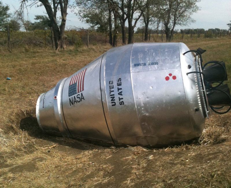 미국 오클라호마주의 윙가논으로 가는 작은 길 옆에는 마치 우주선 캡슐이 떨어진 것 같은 물건이 있습니다. 미국 국기와 함께 'NASA' 그리고 'United States of America'라는 글자가 측면에 선명하게 보입니다. 우주로 쏘아올려진 우주선이 이곳에 불시착 한 걸까요?