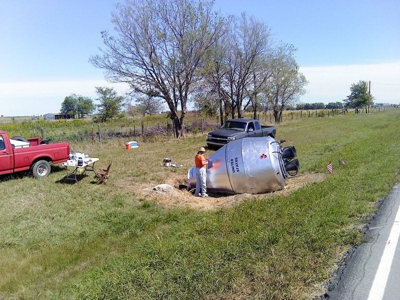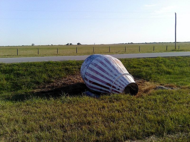 사실 이 우주선 캡슐처럼 보이는 물건은 레미콘 차량(Remicon Truck)에 있는 믹서입니다. 어떻게 된 일일까요? 이 우주선으로 둔갑한 레미콘 믹서는 1959에 길 옆으로 떨어진 잔해입니다. 1959년 당시 오올로가(Oologah) 호수에 다리를 건설하는 데 쓰이던 레미콘 트럭입니다. 레미콘을 운반하던 중 사고로 길 옆으로 낙하하였던 모양입니다.