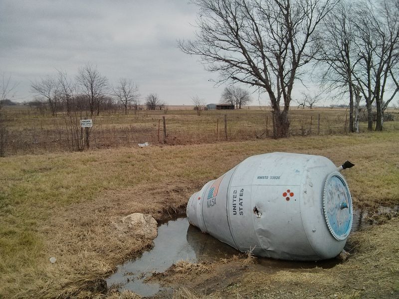 미국 오클라호마주의 윙가논으로 가는 작은 길 옆에는 마치 우주선 캡슐이 떨어진 것 같은 물건이 있습니다. 미국 국기와 함께 'NASA' 그리고 'United States of America'라는 글자가 측면에 선명하게 보입니다. 우주로 쏘아올려진 우주선이 이곳에 불시착 한 걸까요?
