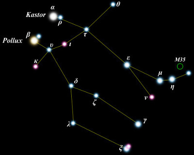 알파별인 카스트로는 2등성으로 망원경으로 관측할 수 있는 쌍성이고 베타 별인 폴룩스는 35광년 떨어진 1 등성 별입니다. 이 겨울철 별자리인 쌍둥이자리는 매년 12월 13~14일경 유성우를 볼 수 있는 별자리이기도 합니다.