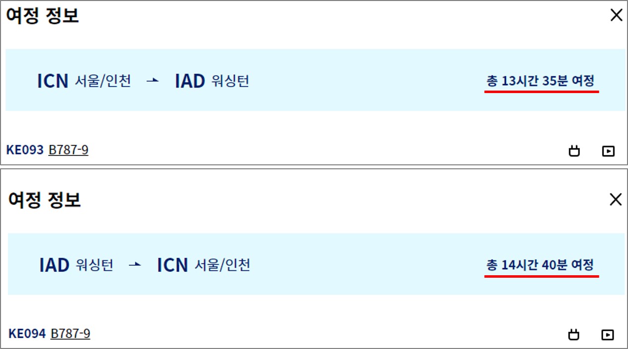 - 미국 워싱턴 → 인천공항 : 14시간 40분 (북극 항로 이동)