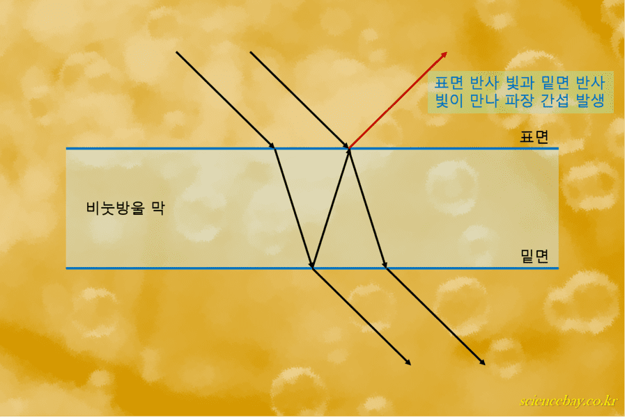 빛의 반사는 두군데에서 일어나는데 비눗방울 막의 제일 바깥쪽 표면에서와 안쪽 내부 밑면에서 입니다. 표면에서 반사한 빛과 밑면에서 반사한 빛이 만나면 밑면에서 반사된 빛이 좀 더 긴 거리를 이동하였기에 파동의 간섭이 일어날 때 파동의 진폭이 변하게 됩니다.