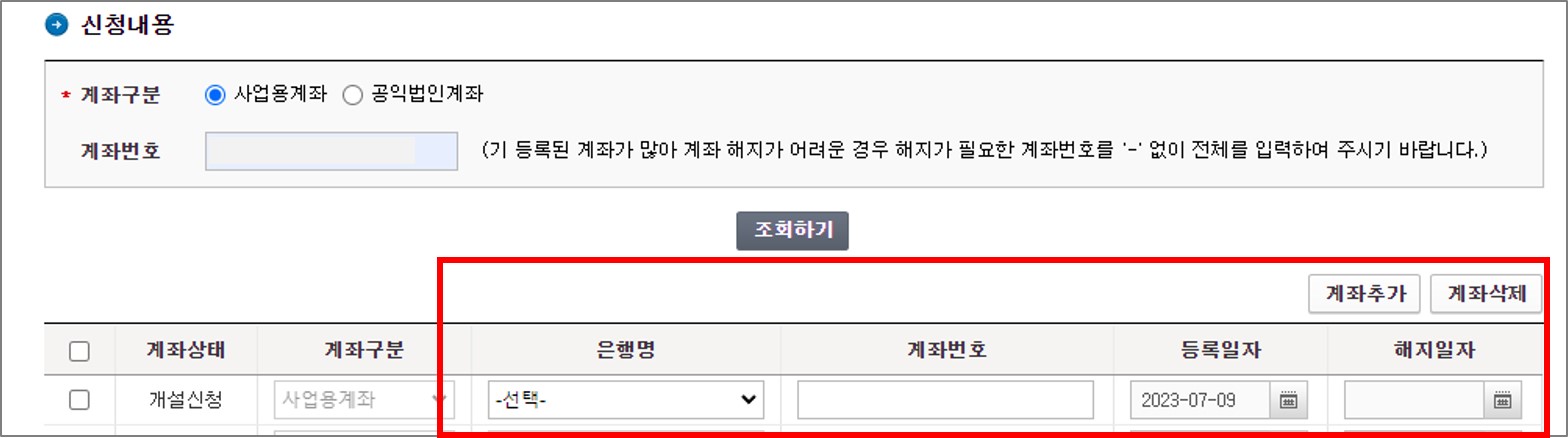 내 사업장에 대한 정보가 나온 상태에서 신청내용 중 계좌번호를 입력하고 조회합니다.
