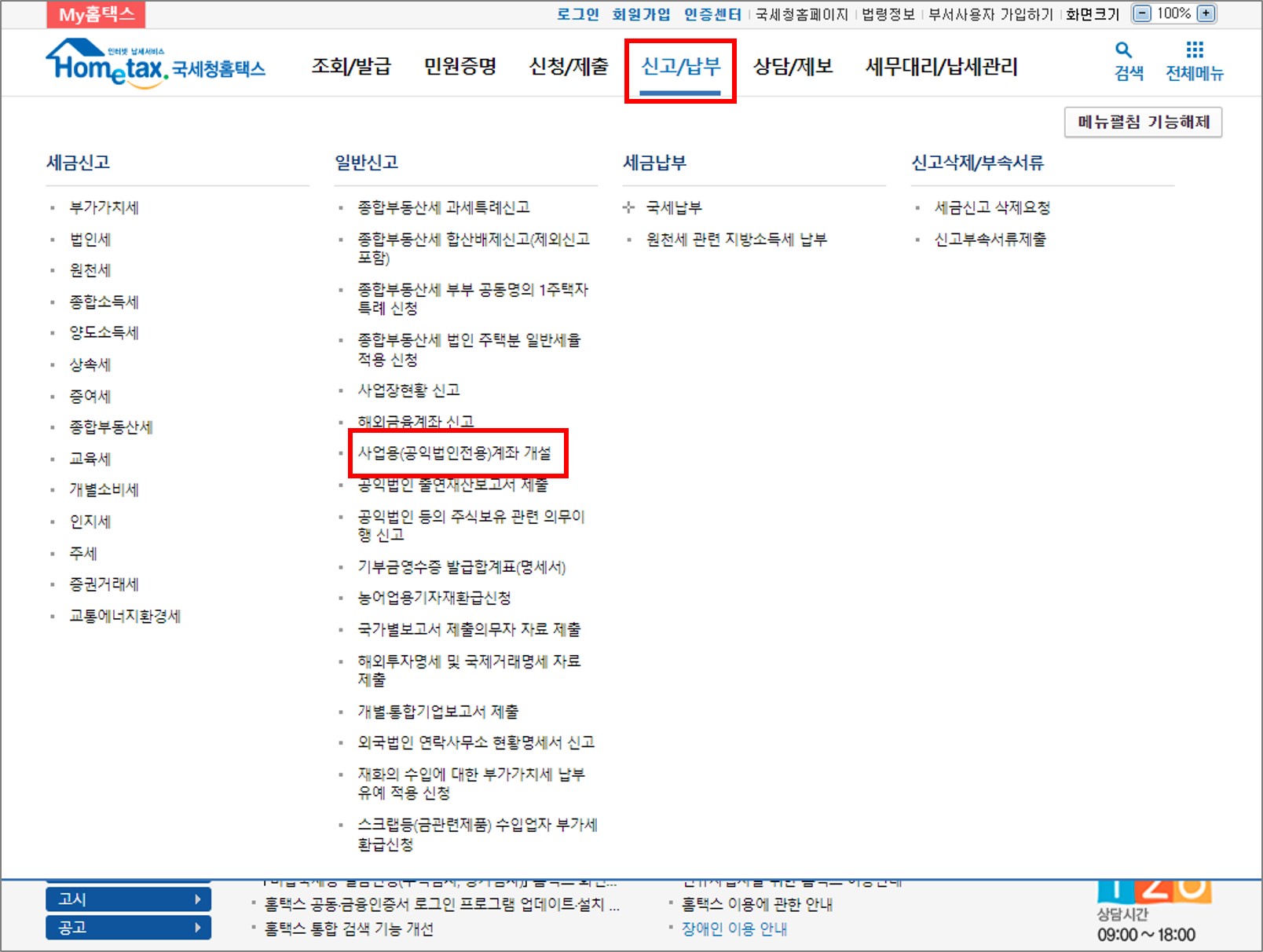 국세청 홈택스에 들어가서 메뉴 중 신고/납부 > 일반 신고 > 사업용 계좌 신고로 들어갑니다.(로그인이 되어 있어야 합니다.)