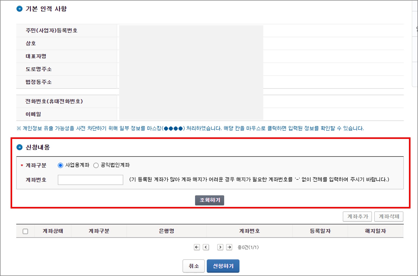 내 사업장에 대한 정보가 나온 상태에서 신청내용 중 계좌번호를 입력하고 조회합니다.